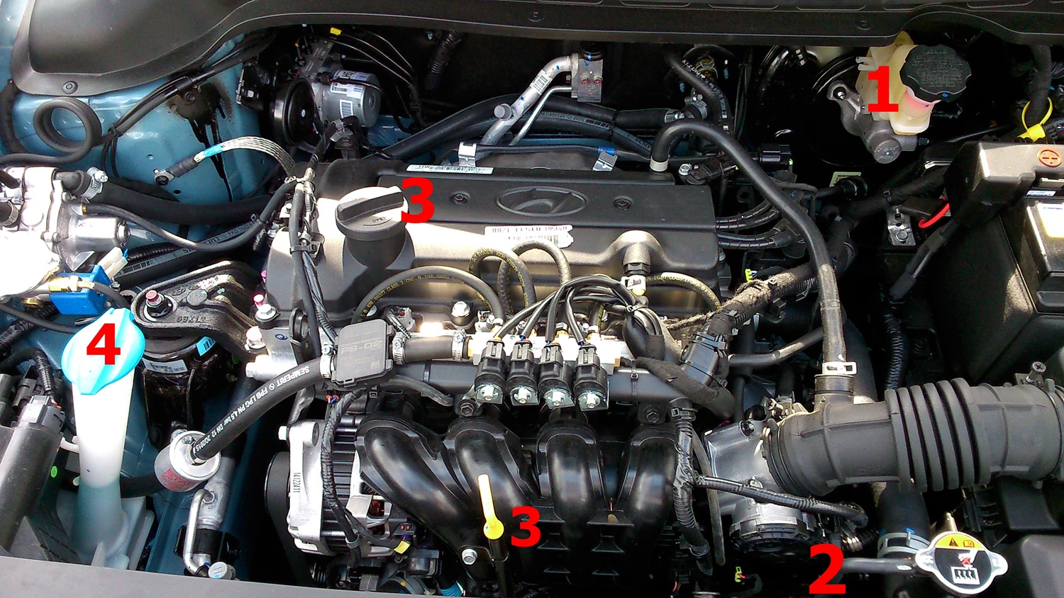 Na zdjęciu zbiornik wyrównawczy płynu chłodniczego zaznaczono numerem 2 (zbiornik znadjuje się "pod" obudową przedniej części maski samochodu, dlatego nie widać go na zdjęciu; wlewu płynu chłodniczego nie należy mylić z korkiem widocznym obok).